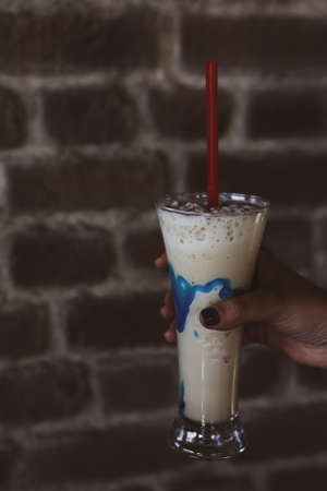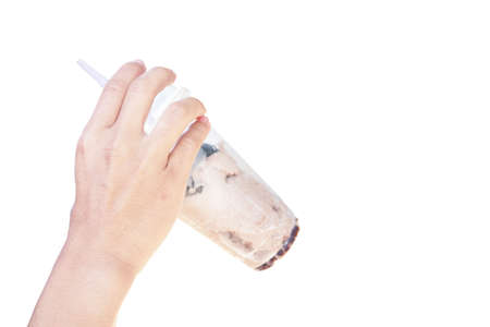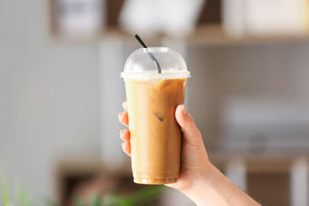 Hand holding ice milk in plastic glass drink for summer, color hipster style and soft focus