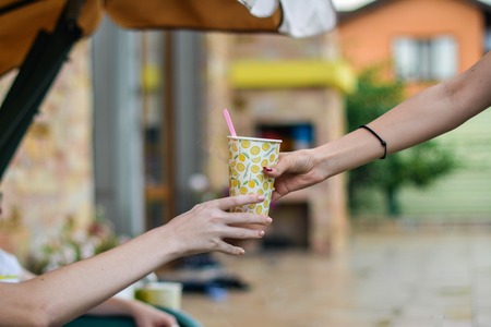 A simple, kind gesture captured as one person passes a freshly stirred takeaway coffee to another.
