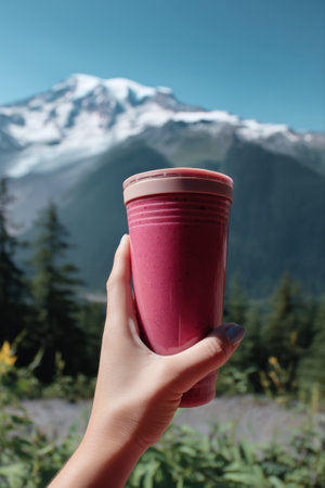 Eco-Friendly Pink Smoothie in Reusable Cup Against Scenic Mountain Landscape