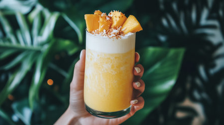 Mango and coconut smoothie in a tall glass, holding it in your hand generative ai