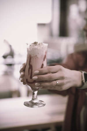 Woman holding a glass of chocolate milkshake with whipped cream and chocolate sprinkles
