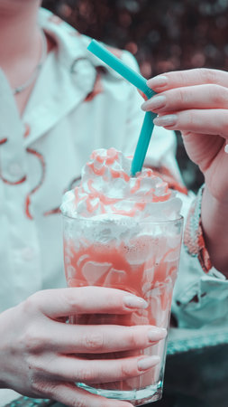 Cold cofffee blended with whipped cream on top and red tube. Close up on hand