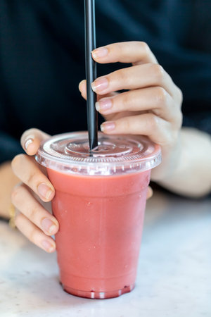 Fresh strawberry juice in female hands, closeup. Healthy lifestyle.