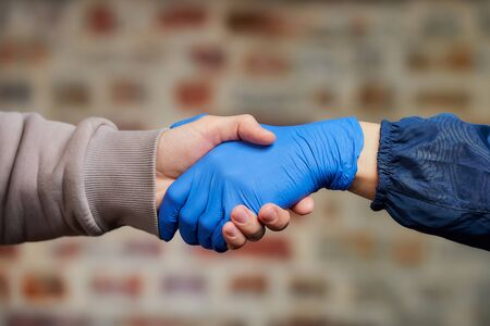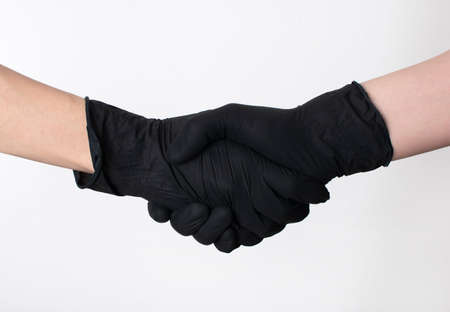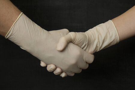 Handshake, greeting in medical rubber gloves. Hands in white medical latex rubber gloves on black background. Protective disposable gloves to protect against viruses, coronavirus, dangerous bacteria.