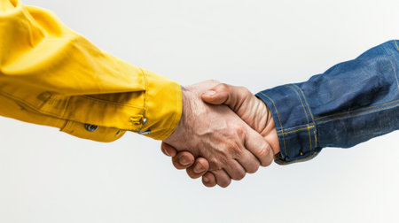 Friendly Handshake in Casual Work Attire, A strong, amiable handshake between two individuals dressed in casual yellow and blue work attire signifies teamwork and agreement.