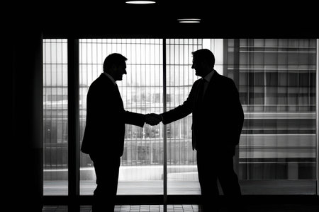 Two men in business suits are engaging in a handshake, silhouetted against large windows showcasing a city skyline. The atmosphere suggests a formal negotiation or agreement.