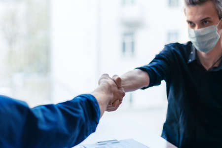 Handshake of two men after successful negotiations. Two friendly colleagues greeting each other.