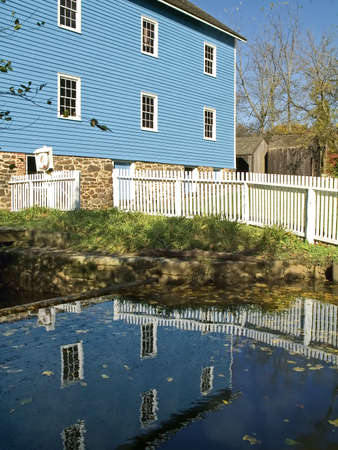 A historic blue mill reflects off the water.