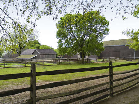 Amish country field agriculture, beautiful brown wooden fence, farm, barn in Lancaster, PA US.