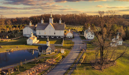 An Aerial View at Sunset of Antique Restored Barns
