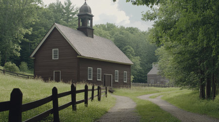 Colonial idyllic rural village scene with barn store house outbuilding