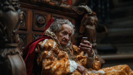 An elderly man in a richly detailed historical costume is seated indoors, immersed in using a smartphone, blending past and present.