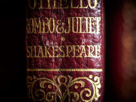 An old book by Shakespeare and a red rose sit on a white background; symbol of love and passion