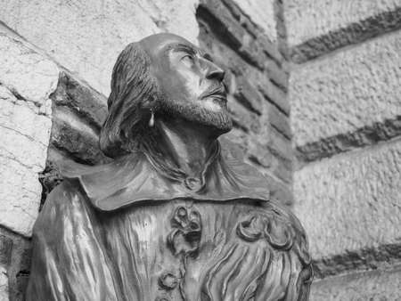 VERONA, ITALY - CIRCA MARCH 2019: William Shakespeare bronze bust statue in Verona, the city of Romeo and Juliet in black and white