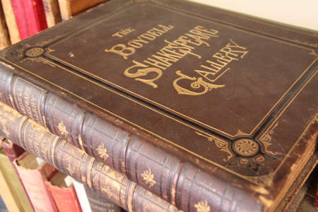 of aged copy of the complete works of shakepseare open at the first page of henry v on a cracked aged wooden surface