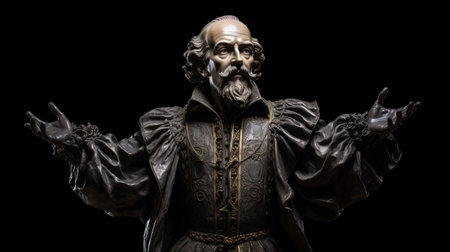 shakespeare statue, studio portrait style, solarizing master, wrought iron, historical reimagining, highly polished surfaces, close-up intensity, cardboard material, black background. ai generated