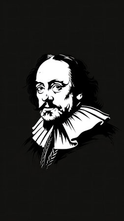 Classic black and white portrait of historical figure with text on black background Shakespeare portrait