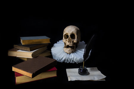 Books with a quill, inkwell, skull and gola .on dark background concept of universal literature