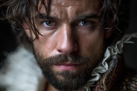 A man in period clothing stares intensely, showing his rugged features and rich attitude in soft lighting.