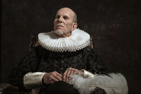 Official portrait of historical governor from the golden age. Sitting in chair. Studio shot against dark wall.