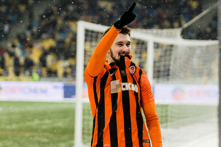 Kiev, Ukraine - December 12, 2016: Facundo Ferreyra of Shakhtar Donetsk celebrating scoaring a goal during Ukrainian Premier League match against FC Dynamo Kyiv at NSC Olimpiyskiy stadium.