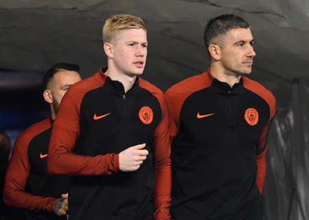 MANCHESTER, ENGLAND - NOVEMBER 1, 2016: Kevin De Bruyne (L) and ALeksandar Kolarov (R) of City pictured prior to the UEFA Champions League Group C game between Manchester City and FC Barcelona at City of Manchester Stadium. Copyright: Cosmin Iftode/Picsta