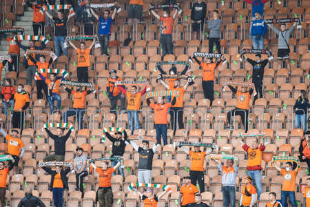 LVIV, UKRAINE - March 10, 2016: FC Shakhtar Donetsk supporters show their support during UEFA Europa League Round of 16 game against RSC Anderlecht at Lviv Arena in Lviv. Shakhtar won 3-1