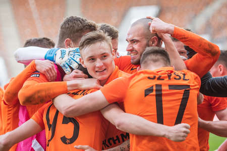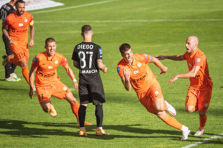 LUBIN, POLAND - SEPTEMBER 20, 2020: Match Polish football league PKO Ekstraklasa KGHM Zaglebie Lubin vs Cracovia 1: 1. Joy Loreno Simic and team of Zaglebie after scoring goal.