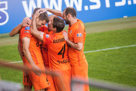 Donetsk, Ukraine - July 10, 2011. Shakhtar players are happy just scored a goal in the gate Obolon Kiev. The match took place at Donbass Arena