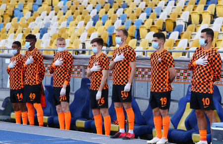KYIV, UKRAINE - JUNE 6, 2020: Shakhtar Donetsk players listen to national anthem before the Ukrainian Premier League game against Desna Chernihiv at NSC Olympiyskyi stadium in Kyiv, Ukraine