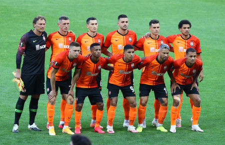 KYIV, UKRAINE - AUGUST 5, 2020: Shakhtar Donetsk players pose for a group photo before UEFA Europa League game against Wolfsburg at NSC Olimpiyskyi stadium in Kyiv, Ukraine