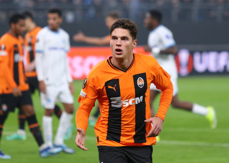 Hamburg, Germany - February 15, 2024: Georgiy Sudakov of Shakhtar Donetsk runs during the UEFA Europa League game against Marseille at Volksparkstadion in Hamburg