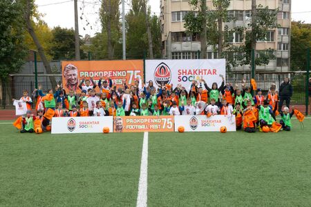 ODESSA, UKRAINE October 26, 2019: FC SHAKHTAR SOCIAL program for development of children's football sports, healthy lifestyles. Younger kick soccer on green futsal field during soccer festival