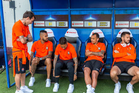 ODESSA, UKRAINE - 07/15/2018: Players of FC SHAKHTER Donetsk on the bench before the start of the UEFA Cup match against FC Dynamo Kiev. Footballers on the bench