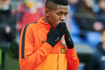 Kharkiv, Ukraine - February 20, 2020: Forward of Shakhtar Donetsk Taison in UEFA Europa League vs Benfica. Film noise on photo