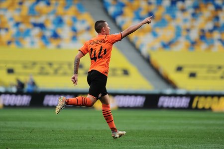 KYIV, UKRAINE - AUGUST 5, 2020: Shakhtar Donetsk players go to the pitch during the UEFA Europa League game against Wolfsburg at NSC Olimpiyskyi stadium in Kyiv, Ukraine