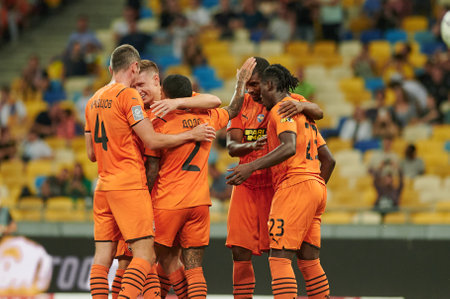 KYIV, UKRAINE - AUGUST 13, 2021: players of Shakhtar celebrating goal during the football match Shakhtar Donetsk vs Metallist-1925 Kharkiv