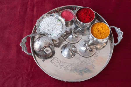 Closeup of silver plate with kumkum & turmeric on the festival of Makar Sankranti. It is one of the few ancient Hindu festivals that has been observed according to solar cycles.