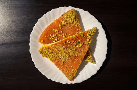 Slices of Eastern dessert kunafa on a white plate on dark black background. Top view. Arabic cheese kunafa on dark.