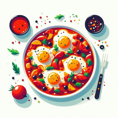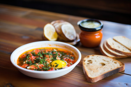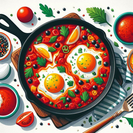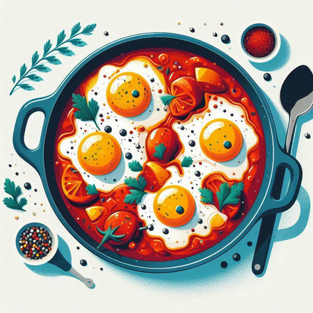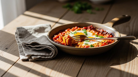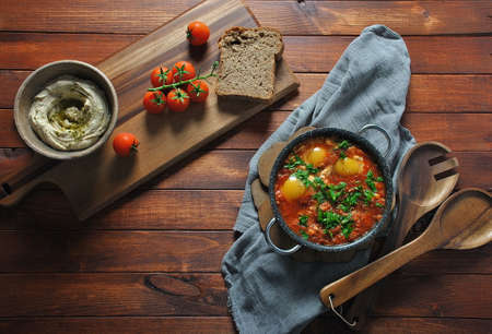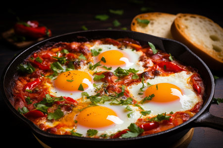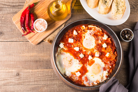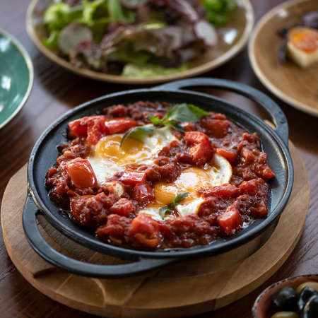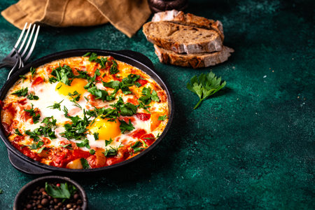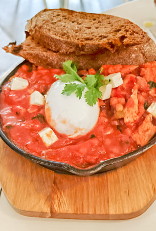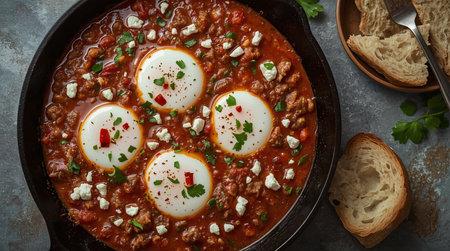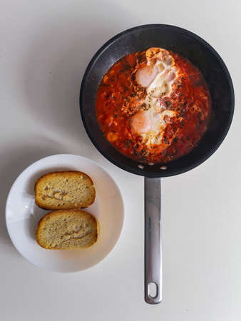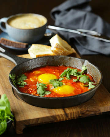 Breakfast with Turkish spicy shakshuka, still life