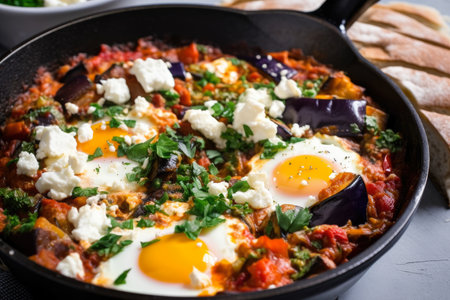 Close-up of Shakshuka with Crispy Baked Eggplant and Feta Cheese, AI Generated