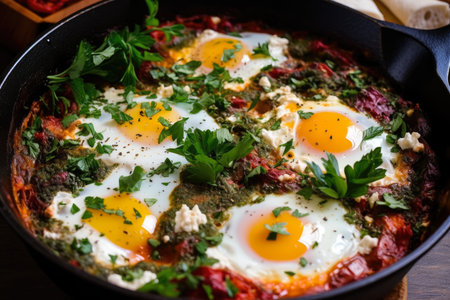 Delicious shakshuka with poached eggs and fresh herbs in cast iron skillet.
