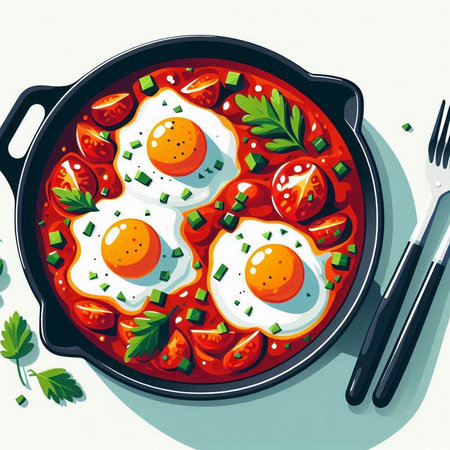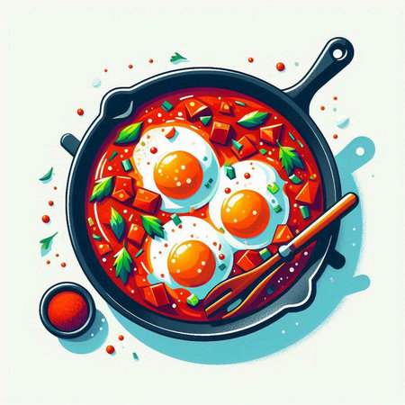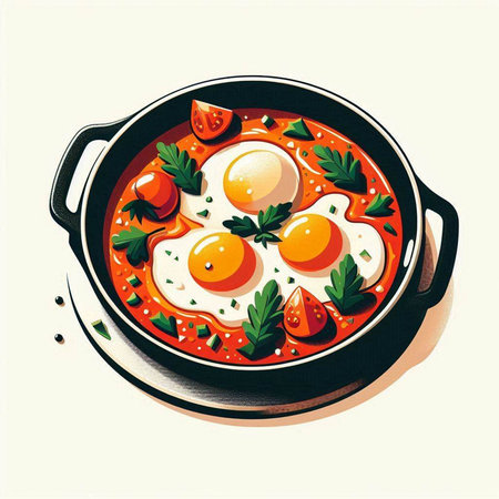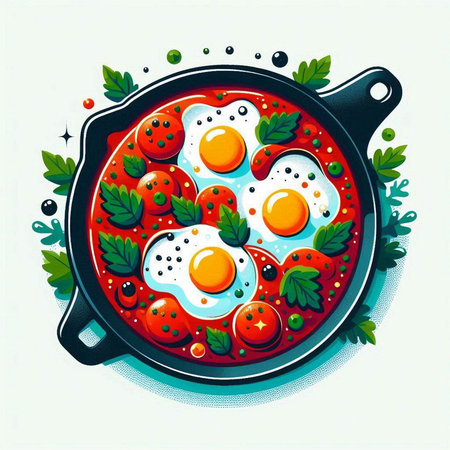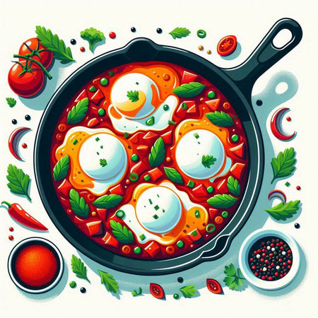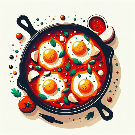 Eggs in tomato sauce in a pan. Vector illustration.