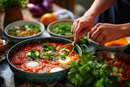 couple garnishing cooked shakshuka with cilantro