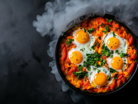A Delicious shakshuka with five eggs, tomatoes, and herbs in black bowl, surrounded by smoke, creating warm and inviting atmosphere