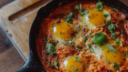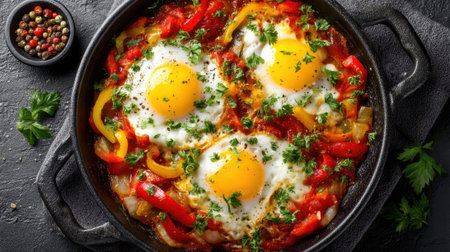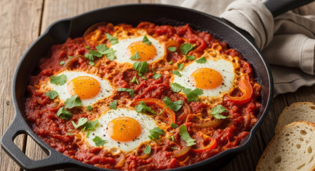Delicious shakshuka with eggs and peppers in cast iron skillet.