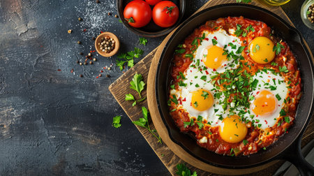 Shakshuka - poached eggs in tomato sauce, onion, pepper and spices in iron pan on dark wooden table with copy space. Famous traditional Arabic and Israeli breakfast - chakchouka. Top view.