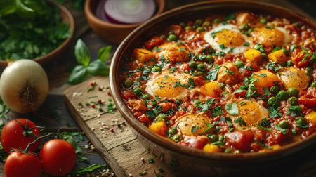 Shakshuka Breakfast, Healthy Vegetable Shakshuka with Eggs, Traditional Israel Shakshuka, Copy Space, Generative AI Illustration