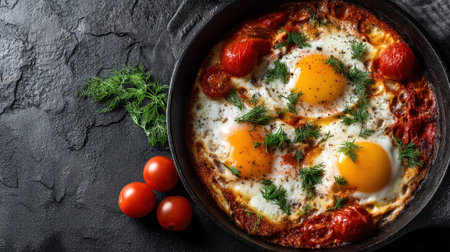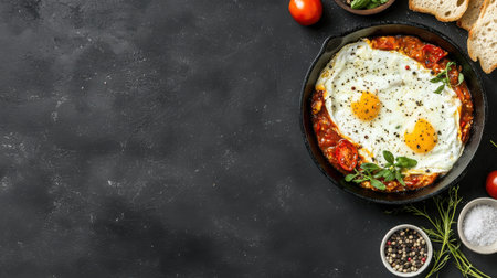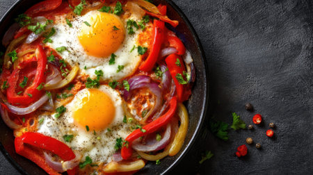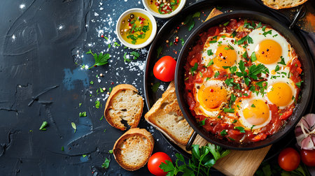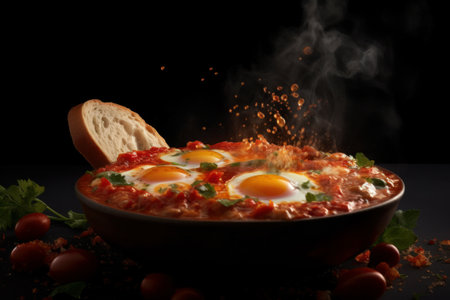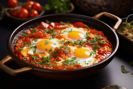Shakshuka Breakfast, Healthy Vegetable Shakshouka with Eggs, Traditional Israel Shakshuka on Dark Background, Abstract Generative AI Illustration
