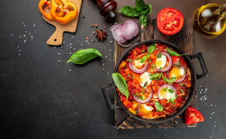 Shakshuka in pan on rustic background. Middle eastern traditional dishes. Fried eggs with vegetables. Space for text. Top view.